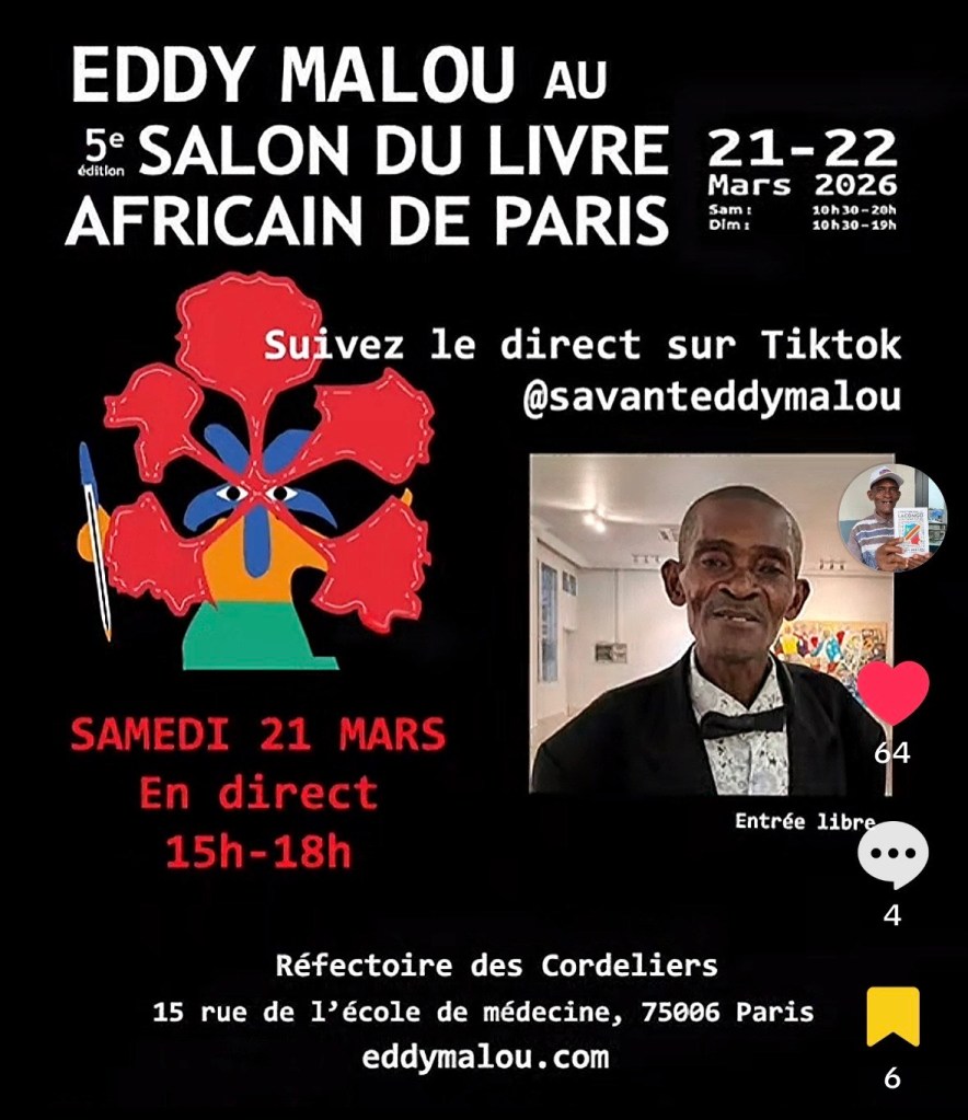Le Salon du Livre Africain de Paris est un rendez-vous majeur de l’édition africaine en Europe. L’événement attire chaque année des milliers de visiteurs. Dans les murs de la prestigieuse école de médecine, Eddy Malou a pu échanger avec ses fans, dont les plus jeunes étaient venus de Quimper (!). Les échanges se sont poursuivis à la table des éditions Paari, invités par M. Mawawa, fondateur de cette maison historique, avec les auteurs Emmanuel Longi Ngizulu (@Vova_Kikongo) et Bruce Mateso, Tugdual de Morel de la Revue Affixe, et notre amie le docteur Jeannette Kashale.